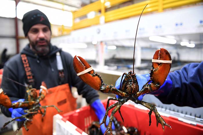 3月29日,在美国缅因州波特兰附近的海岸龙虾公司,两名工人把龙虾装箱。 新华社记者殷博古 摄