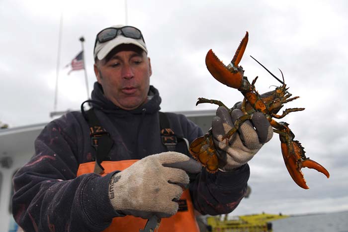 3月29日,在美国缅因州东部的克莱德港,捕虾人格里·库什曼展示刚从海上捕到的龙虾。 新华社记者殷博古 摄