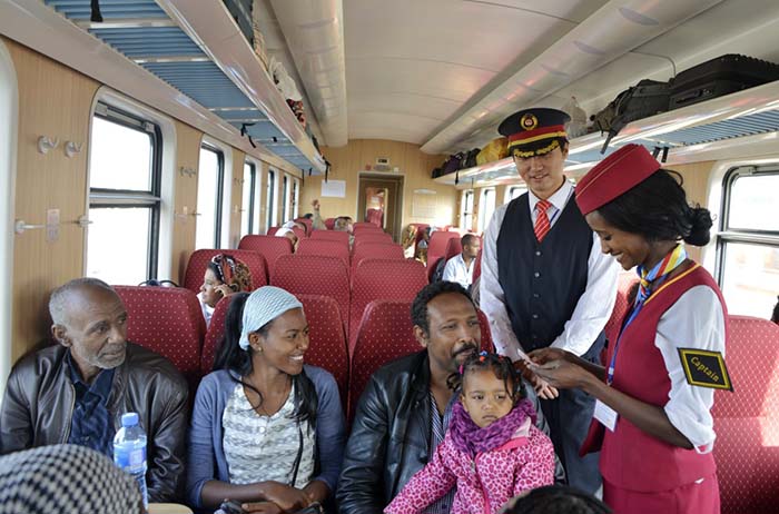 2018年3月25日,列车员在亚吉铁路一列列车上核实旅客车票。 新华社记者王守宝 摄