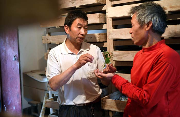 6月20日,连河村党支部副书记、兴旺蚕桑合作社理事长雷利峰(左)在残疾人许刚印的养蚕室帮助解答技术问题。