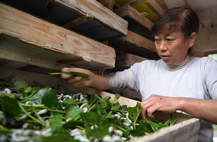 6月20日,连河村村民姚晓玲在家养蚕。2018年,通过养蚕,她家四口人人均收入约7000元。 新华社记者陶明 摄
