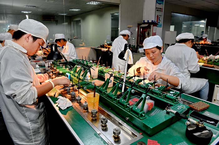 7月27日,位于莆田的一家光电产品公司的工人在生产线上劳作。 新华社记者张国俊 摄