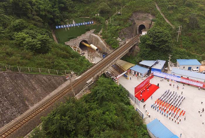 8月6日无人机拍摄的渝怀二线涪秀段新白沙沱隧道贯通仪式现场。