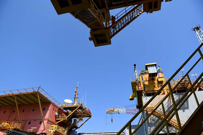 渤海湾埕北油田B平台的一名工作人员在高空作业(9月5日摄)。 新华社记者岳月伟 摄