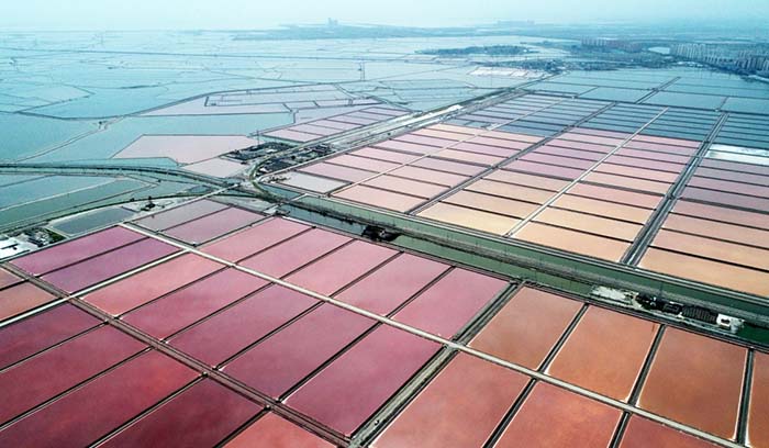 近日,天津长芦汉沽盐场开始秋季扒盐,鸟瞰阳光下一个个纵横排列的盐池,犹如色彩斑斓的调色板。 新华社记者岳月伟 摄