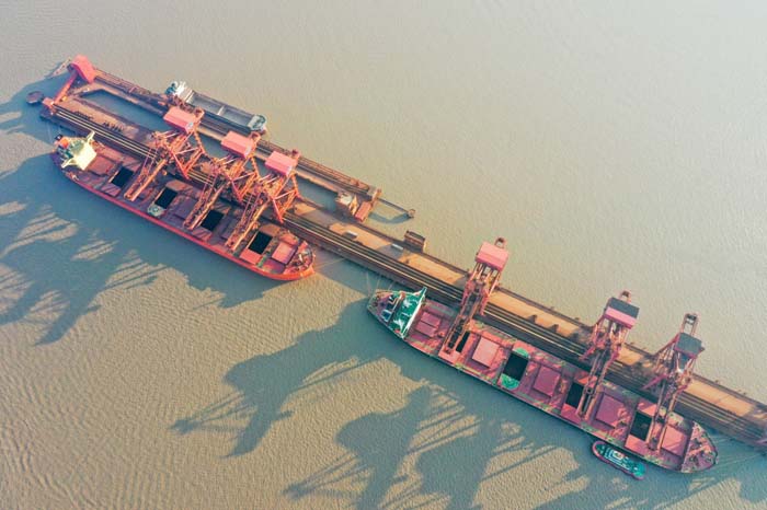 1月30日,在浙江省宁波舟山港北仑港区矿石码头,货轮在进行装卸作业(无人机照片)。 新华社发(蒋晓东 摄)