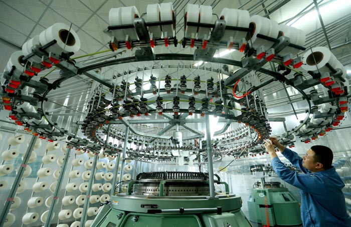 2月18日,在位于山东省青岛市即墨区的青岛颐和针织有限公司,工人在生产服装面料产品。 新华社发(梁孝鹏 摄)