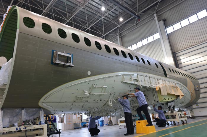 在航空工业沈飞民机车间,工作人员进行机身装配工作(4月25日摄)。