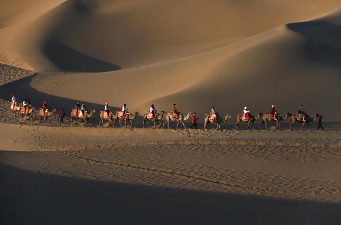 6月9日,游客在甘肃省敦煌市鸣沙山月牙泉景区游览。 新华社发(张晓亮 摄)