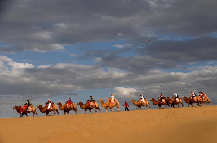 9月16日,游客在甘肃省敦煌市鸣沙山月牙泉景区游览。 新华社发(张晓亮 摄)