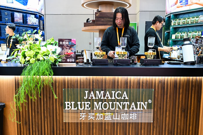 农食品展区,参展商正在现场制作牙买加蓝山咖啡。(摄影:魏尧)