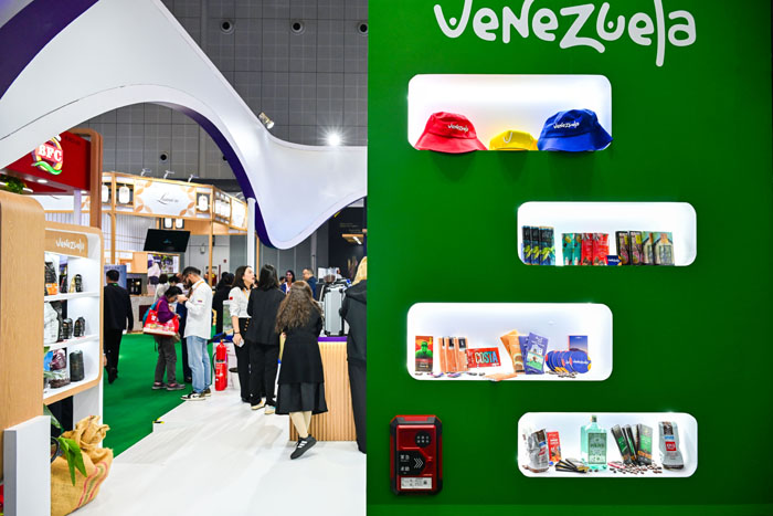 农食品展区内,委内瑞拉食品馆内展示的各类特色商品。(摄影:魏尧)