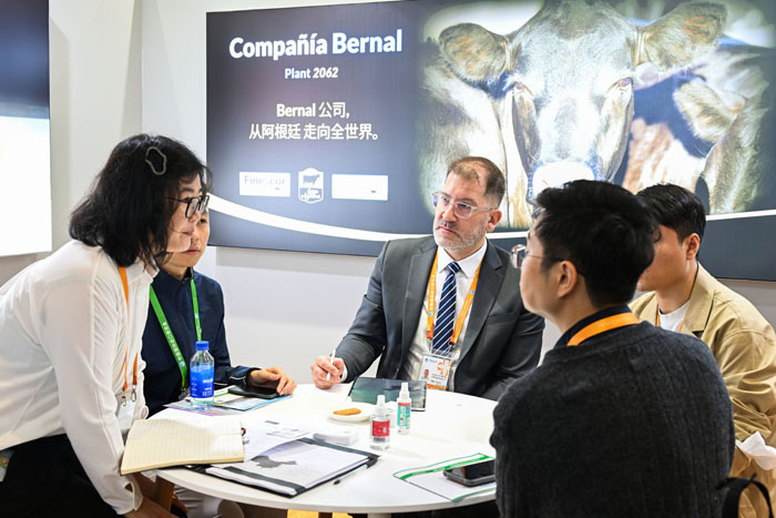 来自阿根廷的牛肉厂商Bernal的工作人员正在同中国与会者洽谈业务。(摄影:魏尧)