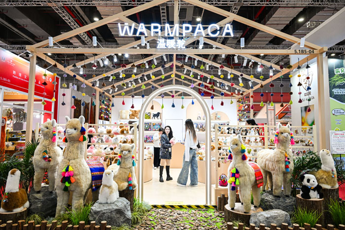 消费品展区的温暖驼品牌展台展示的羊驼绒毛绒玩具。这家来自秘鲁的企业连续八年来到上海参展,是进博会“全勤生”。(摄影:魏尧)