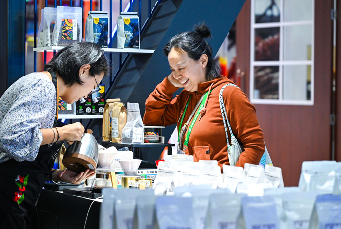 观众在国家综合展区萨尔瓦多国家馆品尝当地特色咖啡。(摄影:魏尧)