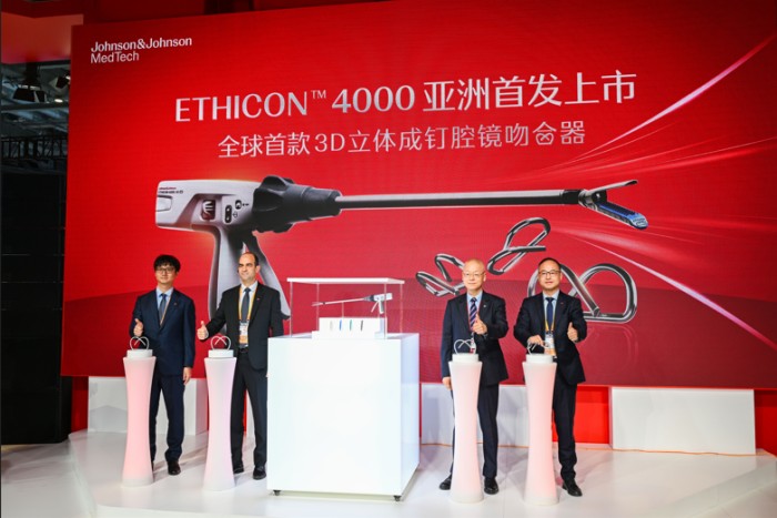 强生展区举行全球首款3D立体成钉腔镜吻合器ETHICON 4000亚洲首发上市仪式。(魏尧摄)