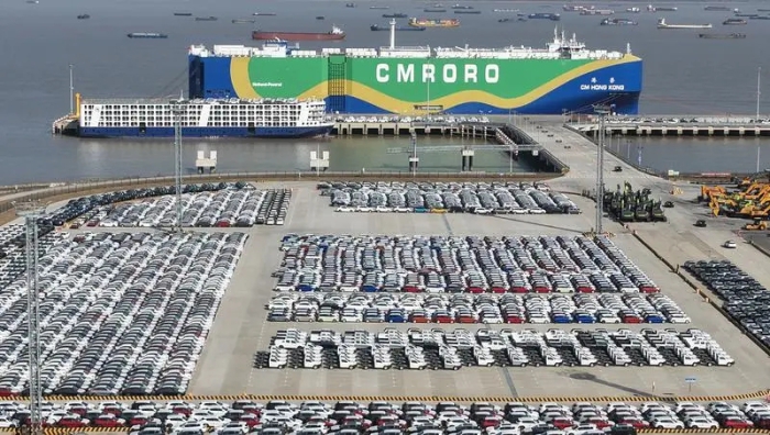 12月9日,在江苏省苏州港太仓港区,“港荣”号甲醇双燃料动力滚装船在装载出口汽车(无人机照片)。今年1至11月,太仓海关监管的太仓口岸出口汽车约77万台,同比增长76.5%,出口至比利时、巴西、沙特等170余个国家和地区。新华社发(计海新摄)