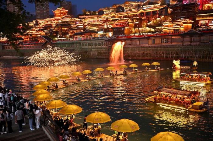 4月4日,湖北省宣恩县城贡水河上进行的火壶和打铁花表演吸引众多游客观赏。新华社发(宋文 摄)