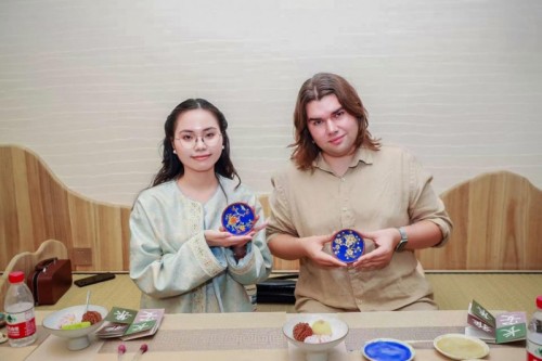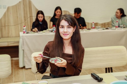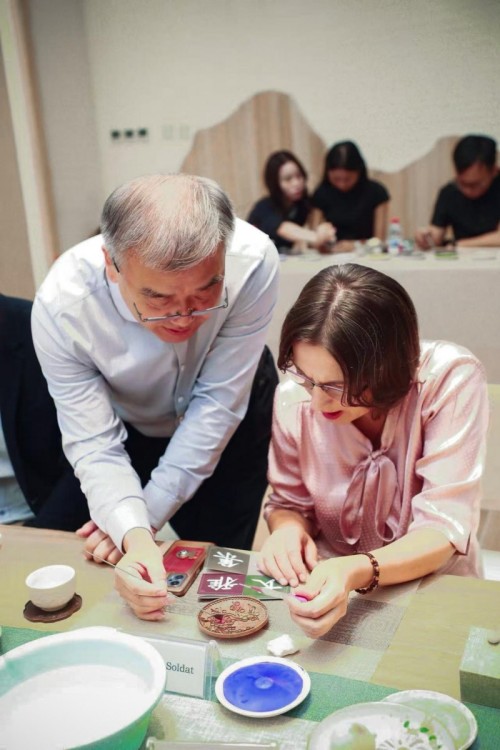 本次活动特别设置手工体验环节,嘉宾们在钟连盛的指导下亲身体验景泰蓝“点蓝”工艺。参与者将彩釉填入铜丝界定的纹样中,在实践中感受每一处釉彩的凝练与传承之不易。这种轻量化、沉浸式的互动,不仅拉近了公众与非遗的距离,也让传统技艺以更亲切的方式融入现代生活体验。