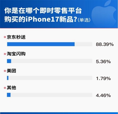 从购机渠道看,线上已成绝对主流销售场域,79.98%用户通过线上购买iPhone 17系列,在线下门店和即时零售购入新机的用户则分别占比13.21%和6.82%。