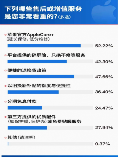 售后服务方面,38.71%用户看重 “售后保障政策完善”,47.66%重视 “便捷退换货政策”。京东整合苹果官方 AppleCare+、平台 “只换不修” 及 “以旧换新” 服务,形成一站式体验,消除用户购机顾虑。其中,38.83% 用户使用 “以旧换新”,截至 9 月 19 日上午 10 点,该服务销量达去年同期 4 倍,27% 用户认可其补贴力度,26% 满意流程便捷、评估透明。