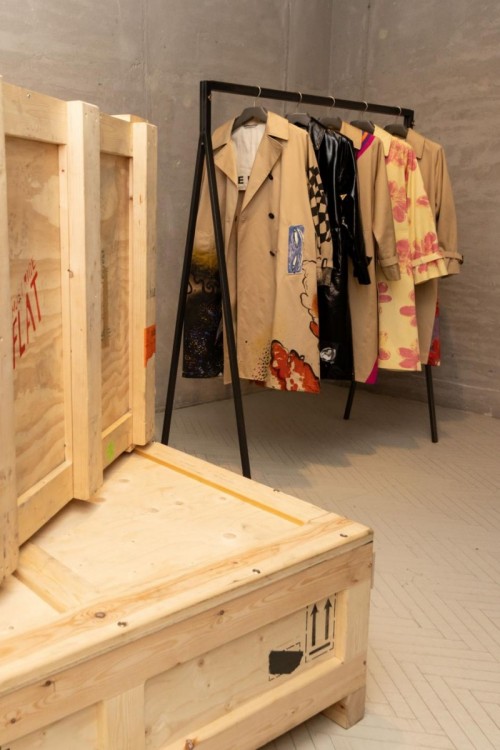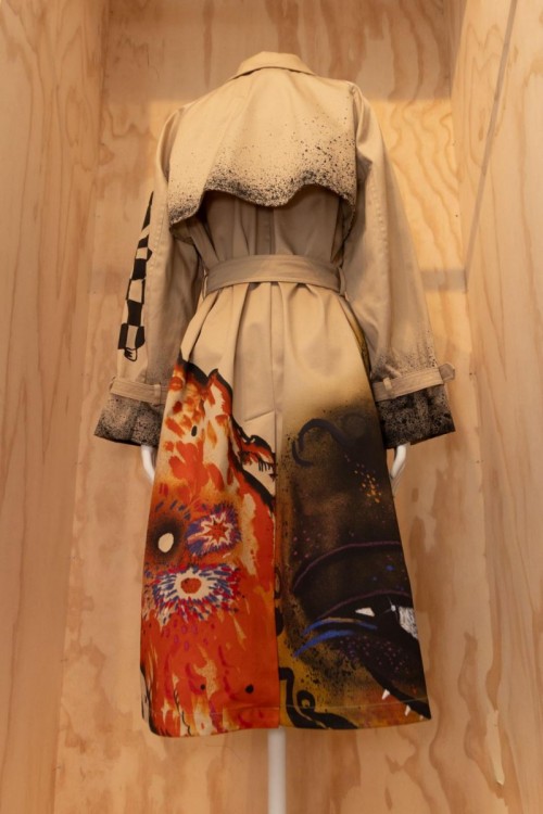 出生于纽约哈莱姆区的艺术家察巴拉拉·塞尔夫以拼贴绘画、版画、雕塑和装置艺术而闻名,并藉由艺术创作探索人的个性以及标识与符号的文化意义。她设计的风衣采用漆面处理的粉彩黄色,并点缀其标志性的粉色“无限之花”(Infinity Flowers) 图案,象征着大自然的脆弱与转瞬即逝之美,正如人类的生命状态一般。“无限之花”如同年复一年绽放的多年生植物,启示我们蜕变是人类与生俱来的本能。这件可穿戴的艺术杰作采用压印工艺,灵感源于古老的蜡染技艺。