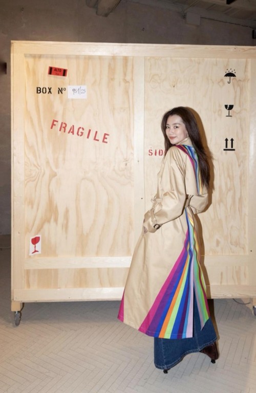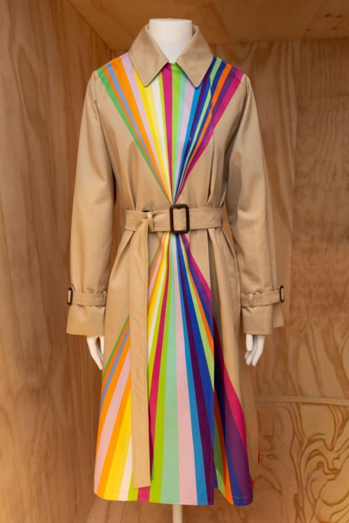 意大利艺术家保拉·皮维将日常物品融入艺术,并巧妙地转变其特质,促使观众重新审视现实。如今,她居住在植被葱郁的夏威夷,岛上明媚充沛的天光,动植物绚烂浓郁的色彩,尤其是几乎每日都横跨天际的双彩虹,皆成为她风衣设计的灵感之源。受这些自然奇观启发,她在风衣的正反面均设计了垂直排列的多彩条纹,打造出收束于腰部的沙漏廓形。