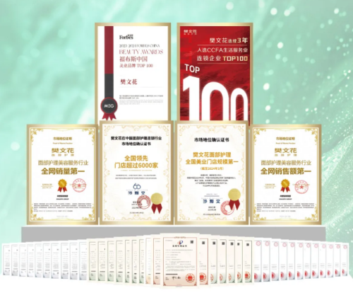 除技术突破外,樊文花的品牌价值同样获得国际权威认可。樊文花品牌创立37年荣获二十多项行业大奖,连续暂获“全国门店突破6000”、“全国美业门店规模第一”、“面部护理美容服务行业全网销量第一”、“面部护理美容服务行业全网销售额第一”四大权威认证,在面部护理赛道上一骑绝尘,更是连续两年获评福布斯中国美业品牌TOP100大奖、连续3年入选中国连锁经营协会生活服务业连锁企业TOP100,以及2025中国香妆品牌发展大会双项大奖。