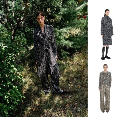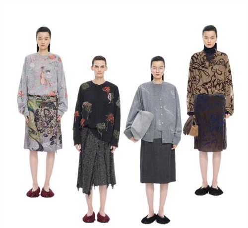 柔软的提花马海毛毛衫,细腻的织物纤维让图案多了一层朦胧感,如同月光映照,安静又舒展。极简风灰色开衫套装,通过水墨晕染的水波纹烫钻这个灵动细节平衡精英感的严肃,凸显「简约即高级」;暗调线条植绒衬衫与同色系长裙的组合,让自然意象在低调中流动;长袖提花套头针织衫配以不规则褶皱半裙或东方皮影半裙,让传统皮影元素成为视觉焦点,兼具叙事感与吸睛度。