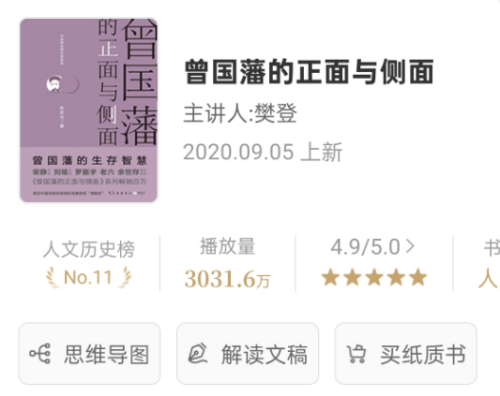 中秋假期,或许你会有一段静谧的夜晚,适合思考人生。这时,帆书樊登讲书板块中的《曾国藩的正面与侧面》便是不错的选择。这本书为我们展现了一个鲜活真实的曾国藩:他一生遭遇五次重大挫折,却始终拙诚、勤勉、务实、自律;他与左宗棠有纠葛也有情谊,其人生经历中还藏着晚清官场的“潜规则”。在樊登老师的解读下,你能透过曾国藩的一生,获得对自我成长和人生选择的全新思考,让这个中秋假期更具收获感。