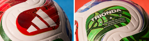 •这款官方比赛用球命名为“三重浪”(TRIONDA),名称取自英语“三”(Tri)与西班牙语“浪”(Onda),红、绿、蓝三色设计旨在向三大东道国致敬