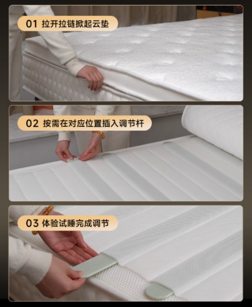 TLK大师定制系列床垫的创新之处在于内置在床垫的专利调节杆系统,这一设计打破了床垫出厂即定型的传统模式。通过专利调节系统可以实现分区精准支撑,用户可根据自身需求,在床垫背部、腰部、臀部等区域的插槽中灵活接入调节杆,实现对局部支撑力的微调,适配所有人群的睡感需求变化,其中包括但不限于: