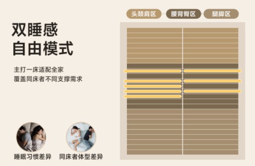 夫妻共眠模式:双人床两侧可独立调节硬度,解决因体重、睡感偏好差异导致的相互干扰问题。