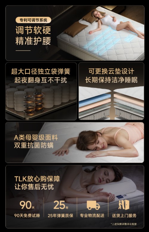 据《2024中国健康睡眠市场趋势报告》显示,能够提供个性化解决方案的床垫品类年增长率达32%,成为睡眠产业的新增长点。TLK推出的90天免费试睡+上门取旧服务,进一步降低了消费者决策风险,推动体验式消费在大家居领域的落地。TLK大师定制系列床垫的创新,不仅是一次产品升级,更象征着睡眠行业从标准化迈向个性化的重要转折。毕竟,真正的好睡眠,从来都不该是将就的结果。