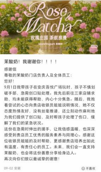9月1日,安庆吾悦广场的一场紧急救助,成为茉酸奶企业文化的生动注脚。一位母亲因孩子手部划伤,先后向三家店铺求助未果,最终在茉酸奶门店得到收银员的及时帮助。店员取出自备的创可贴,快速为孩子清理包扎伤口,缓解了紧急状况。事后,孩子母亲在小红书发文致谢,直言这份帮助“倍感温暖”,称赞店员有“优秀的服务素养与同理心”。