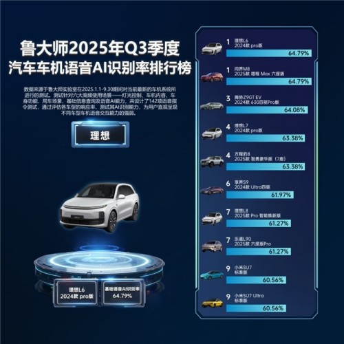 在本期语音测试中,理想L6和问界M8依然稳坐第一梯队,以64.79%的识别率并列榜首,在142项指令中准确完成92项,展现出目前最成熟的语音交互水准。