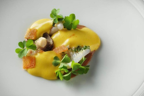 轻熏挪威鲑鱼以柔和烟香开启味蕾,搭配以鱼子与酸奶调和的细腻酱汁,并融入柚子香气的西洋菜沙拉。佐酒选用来自卢瓦尔河谷的白葡萄酒,带有苹果与洋梨的果香及清冽余韵,与鲑鱼鲜味完美呼应,形成优雅清爽却不失圆润平衡的酒食协奏。