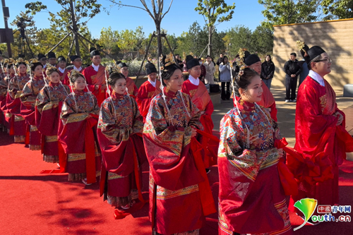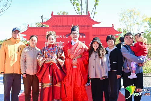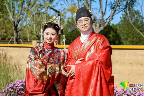 中国青年网北京10月19日电(见习记者 菅浩云 记者 杨月)今天上午,北京通州路县故城遗址公园,12对新人身着美丽的传统婚服,在跨越两千年的历史遗址上,以古礼共缔鸳盟。这是以“清风古韵 一潞有缘”为主题的北京市直机关青年集体婚礼上的温情画面,也是北京市直机关第二届青年集体婚礼。