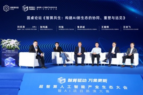 圆桌论坛环节,超智算科技执行董事刘名涛主持开展了以《智算共生:构建AI新生态的协同、重塑与远见》的讨论,与北京北航投资有限公司总经理王剑飞、商汤集团股份有限公司副总裁刘强、峰和资本董事长鲁承诚、智谱生态基金创始合伙人张鸣晨、北京识因智能科技有限公司董事长王春辉围绕“算力如何驱动产业创新”“AI技术商业化路径”及“生态构建的关键要素”等核心议题展开深度对话,观点交锋。