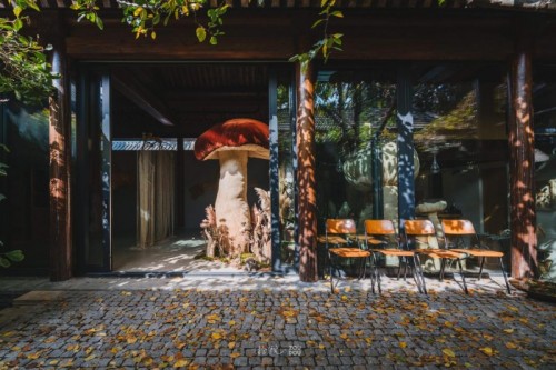 策展人郭承萱表示,四合院的在地性,让艺术家的菌菇作品更富生机,空间与艺术的共生场域营造出超现实趣味:巨大的菌菇仿佛从墙面、房梁、树坑中自然生长而出,在深秋时节展现出独立而磅礴的质感。入口处高达 2米多的巨型菌菇尤为引人注目,采用皮革、丝线与再生布料等多元材质,通过经纬交织的编织手法再现菌丝网络的复杂结构。深入拾院展厅,数十件小型菌菇雕塑以独特的材质组合与色彩搭配呈现,通过根系相互连接形成依存菌群。
