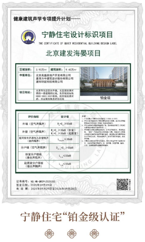 当房地产行业告别规模扩张的旧周期,价值深耕成为破局同质化困局的核心命题。近日,北京建发·海晏荣膺中国城市科学研究会颁发的宁静住宅“铂金级认证”,作为北京首个获此殊荣的项目,这枚国内住宅健康性能最高等级认证的勋章,不仅是对单一项目的褒奖,更成为建发房产“灯塔战略”落地成效的生动注脚。