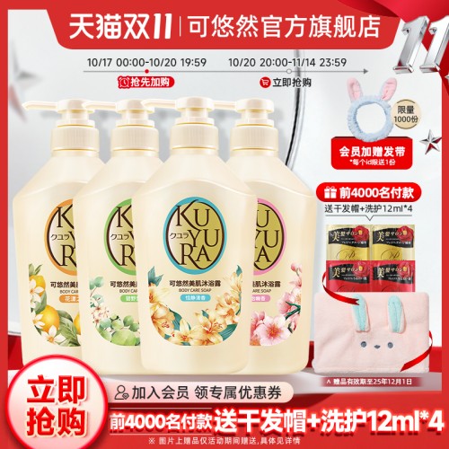 天猫双11现货期间,在kuyura可悠然旗舰店购买可悠然沐浴露550mL 4瓶装,享官方立减15%,再享85折,预估到手价203元;前4000名付款送干发帽和洗护体验装12mL*4,会员还可加赠发带(限量1000份)。
