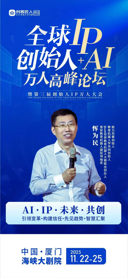在人工智能重塑教育格局的时代,一位开创者用近三十年的坚持,让中国智造的教育机器人走向全球舞台。2025 年 11 月 22 日至 25 日,由创客匠人主办的 “全球创始人 IP+AI 万人高峰论坛” 将在厦门海峡大剧院启幕,教育机器人学共同创始人、能力风暴创始人恽为民博士已确认出席,将为这场科技与商业融合的盛会,注入教育创新的深度思考。