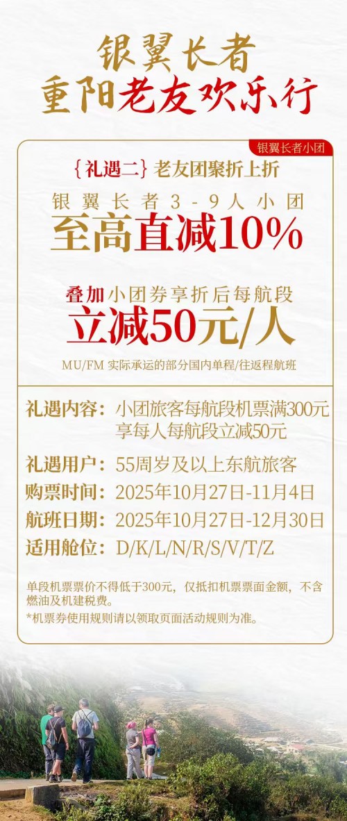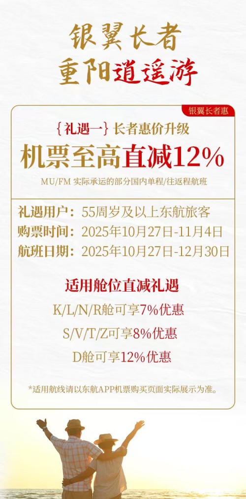 在重阳节来临之际,东航于2025年10月27日至11月4日升级“银翼长者”产品,推出“银翼长者重阳逍遥游”“银翼长者重阳老友欢乐行”两项升级活动,进一步加大优惠力度,为银发族航空出行提供更具针对性、更实惠的方案。