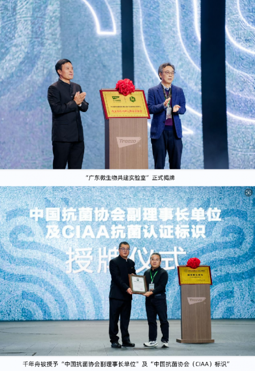 会上,千年舟被授予“中国抗菌协会副理事长单位”及“中国抗菌协会(CIAA)标识”,“广东微生物共建实验室”正式揭牌,“中国室内健康环境创新平台”正式启动,全面展现千年舟在健康、科技领域的创新力与引领力。