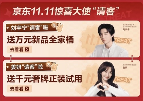 而且京东邀请来的“请客”阵容也十分值得期待。其中,京东新锐代言人、京东11.11惊喜大使刘宇宁将“请客”为消费者送出新品万元全家桶,京东11.11惊喜大使姜妍则将“请客”送出千元奢牌正装试用,此外还有更多明星嘉宾、品牌大佬及上百家品牌的“请客”福利正在持续加码。