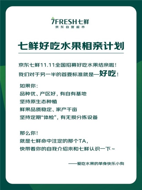 随着七鲜好吃榜的上线,京东七鲜相关负责人也表示,七鲜将在全国范围内长期诚挚招募“有好吃水果”的优质果园,欢迎品种优、产区好、有自有基地、坚持原生态种植、果园为千亩以上的水果源头与七鲜联络,且能够提供稳定的供应。如果水果评测后通过七鲜的“好吃榜”标准,七鲜也将助力单品被更多消费者看见,成为销售额百万级乃至千万级的下一个爆款产品。有意向的水果源头欢迎与“7FRESH七鲜”公众号或小红书后台私信联络。