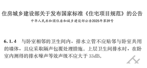 有关部门日前梳理群众对住房不满意的问题,排在第一位的就是隔音问题,不久后,住建部发布的《住宅项目规范》GB 55038-2025明确规定:上层卫生间排水时,卧室内测得的排水噪音不超过33db。