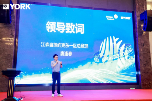大会正式拉开帷幕后,江森自控约克东一区总经理唐逢春率先登台进行领导致辞,深入剖析了当前中央空调行业的市场形势与发展趋势,强调了约克水生态中央空调在技术创新、品质把控以及市场拓展方面的坚定决心,激昂的话语赢得了现场阵阵热烈的掌声。