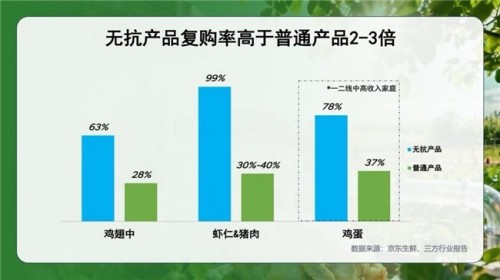 近年来,随着全民健康意识普遍增强,无抗食品概念日益普及,成为健康饮食的代名词,并从高端小众市场加速迈向千家万户的餐桌。以当下销量火爆的无抗鸡肉为例,来自京东生鲜的数据显示,即便价格比普通产品高出30%,仍供不应求。